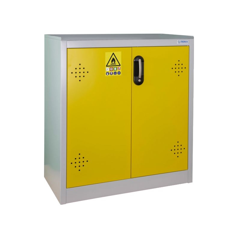 En acier monobloc avec portes battantes à 110°. Solution économique pour le stockage de produits dangereux en toute sécurité et en conformité avec la législation. Fournie avec pictogrammes normalisés : Corrosifs , Toxiques et Inflammables (à apposer selon utilisation). Orifices de ventilation haut et bas au niveau des portes. Fermeture à clé en 3 points. Étagères et bacs de rétention réglables en hauteur sur crémaillères, au pas de 15 mm. Armoire haute à 4 étagères ou basse à 2 étagères. Plan de travail des armoires comptoirs recouvert par un tapis en caoutchouc. Conformes aux articles R5132-66 et R5132-68 du Code de la Santé Publique. Conformes aux recommandations de l'INRS. Charge admissible par étagère : 80 kg UR Coloris : corps gris et portes jaunes Existe avec portes rouges, bleues et vertes, nous consulter.