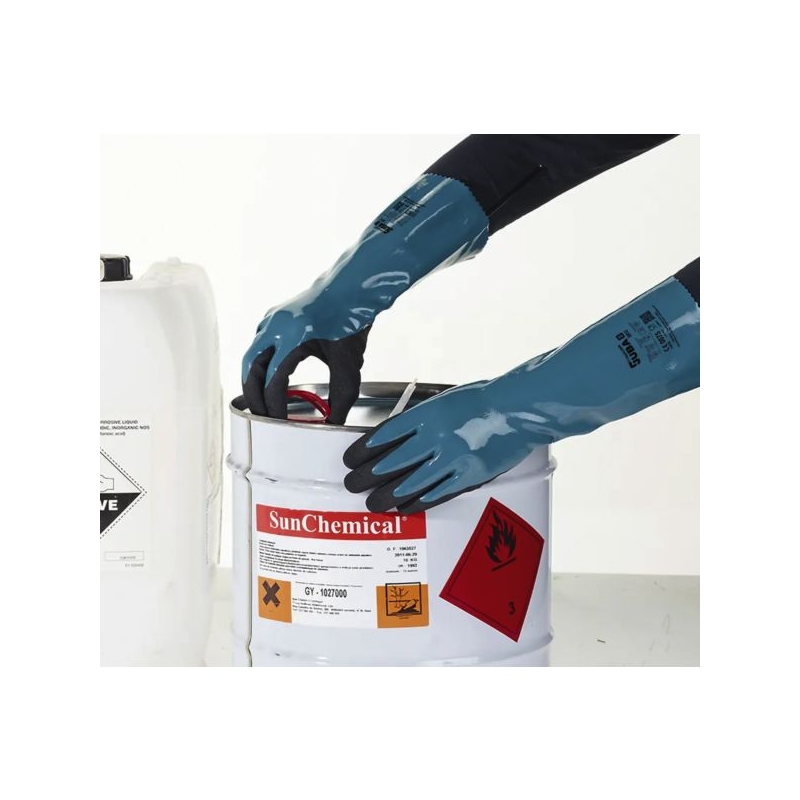 Enduction double couche bipolymère : - 1ère enduction nitrile sur toute la main : cette première enduction nitrile étanchéifie le gant. - 2ème enduction PU base aqueuse : cette deuxième enduction PU avec technologie T-Touch® sur la paume et le pouce renforce la résistance à l'abrasion. le nitrile associé au polyuréthane base aqueuse donne une bonne protection en conditions sèches, humides ou légèrement huileuses. Support tricoté nylon. Environnement : chimique, huileux, humide, sec Applications métiers : industrie aérospatiale, services d'urgence, manipulation de produits chimiques particulièrement caustiques et dissolvants, raffineries et pétrole, maintenance Longueur : 35 cm Épaisseur : 0,80 mm (partie verte) - 1,20 mm (partie noire) Coloris : noir/vert Taille : 8 à 10 Norme : CE Cat III - EN 388 (4121X) - EN 374-1 type B (AJKL) - EN 374-5
