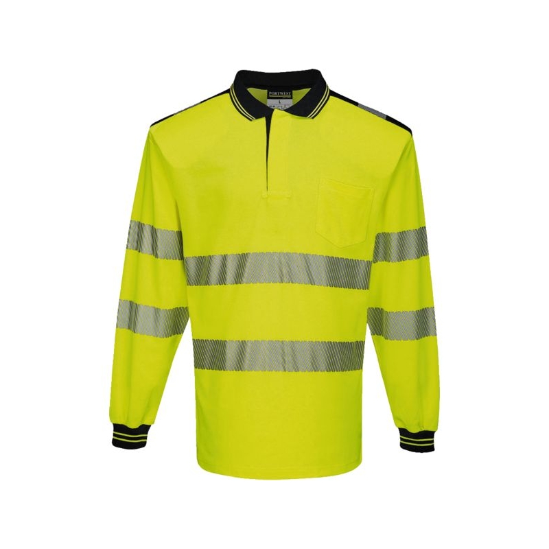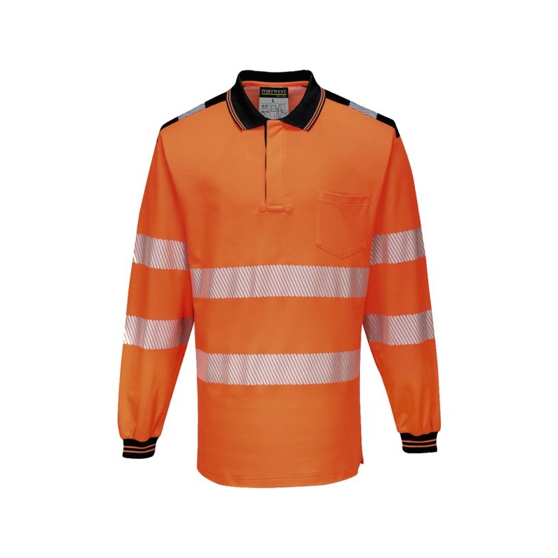 55% coton 45% polyester – Maille piquée, 175 g/m². Bandes rétroréfléchissantes microbilles grises segmentées - respirantes, extensibles et légères. La segmentation de la bande permet l’évacuation de la transpiration et optimise le confort par forte chaleur. Col polo, 1 poche poitrine côté gauche. Manches longues. Protection contre les rayons UV : UPF 35+ Entretien : lavage ménager Coloris : jaune fluo/marine, orange fluo/marine Taille : S à 5XL Norme : CE Cat II - EN ISO 20471 (3)