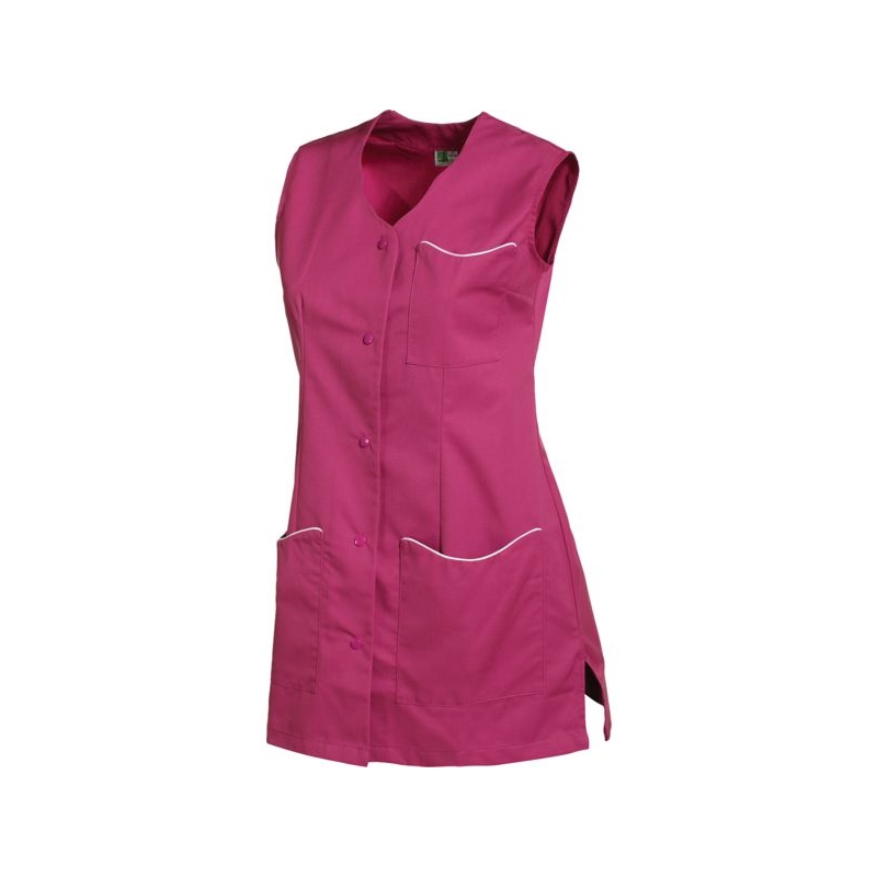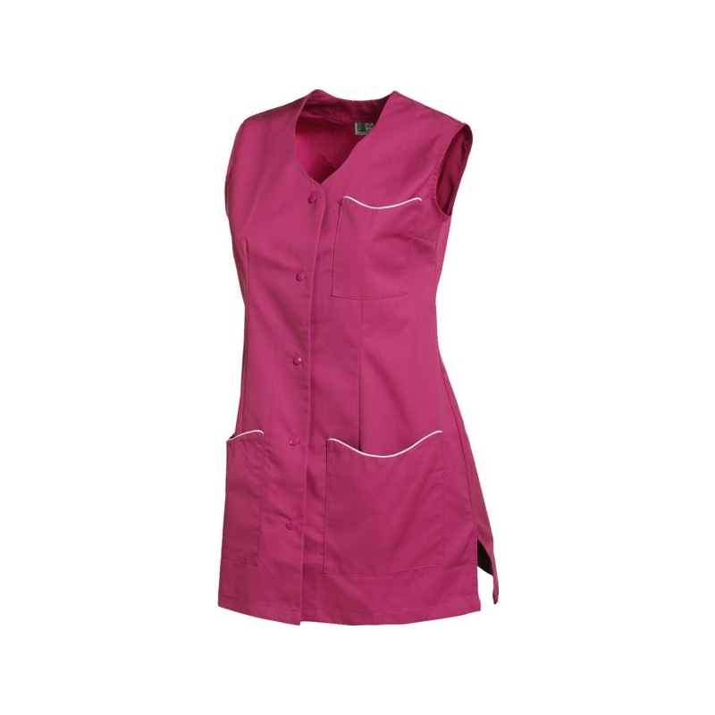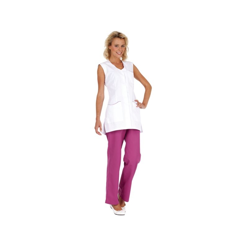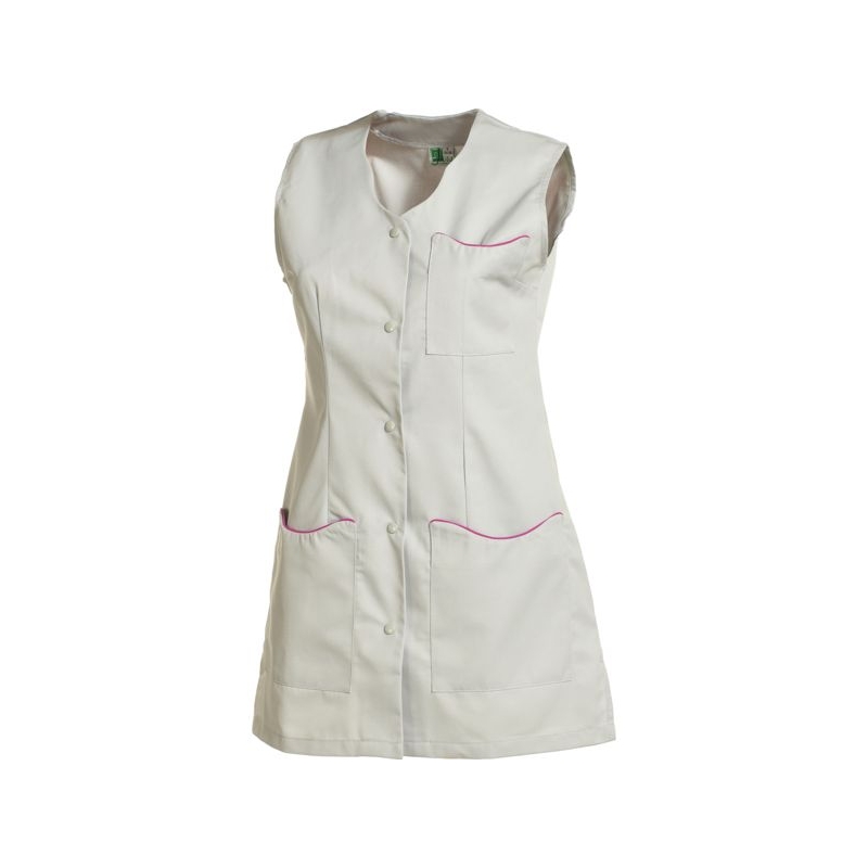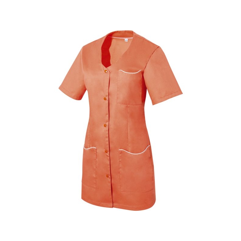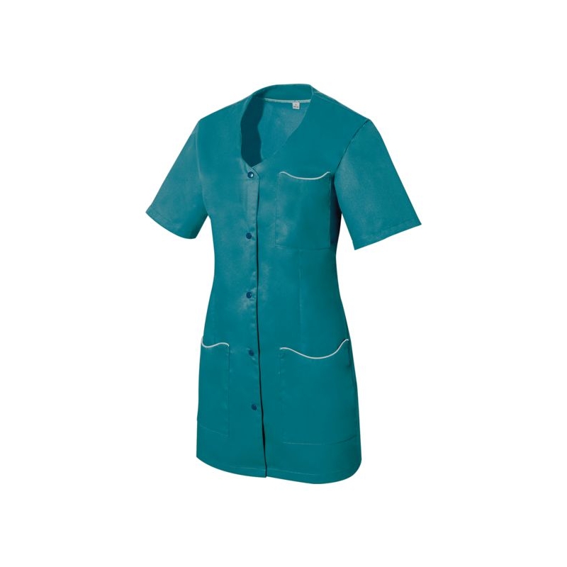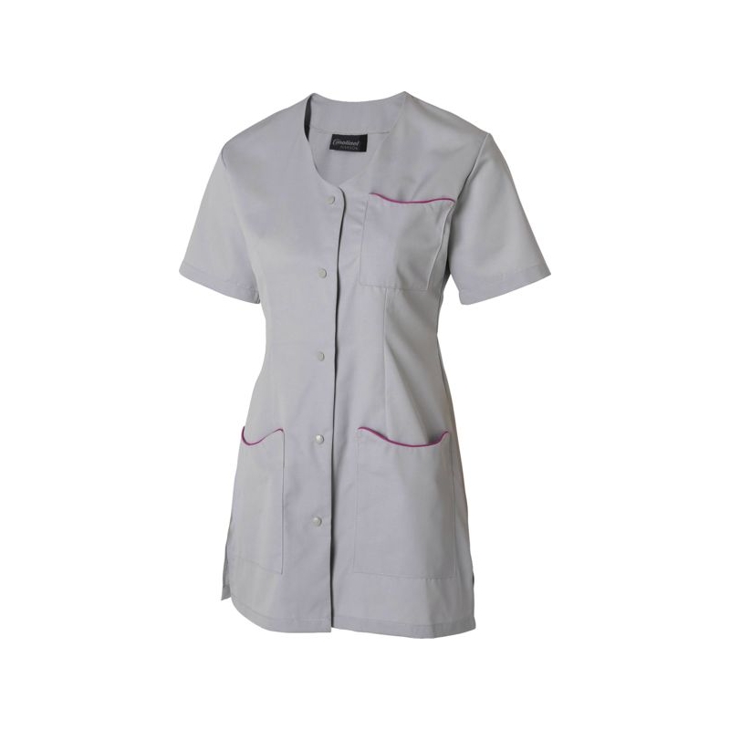 65% polyester 35% coton - Sergé, 210 g/m². Encolure fantaisie, fentes côtés. 1 poche poitrine, 2 poches basses plaquées. Fermeture centrale par 5 pressions couleur. Longueur : 80 cm Entretien : adapté au lavage industriel selon la norme ISO 15797 Coloris : blanc, gris perle, parme, rose, vert anis Taille : 0 à 6